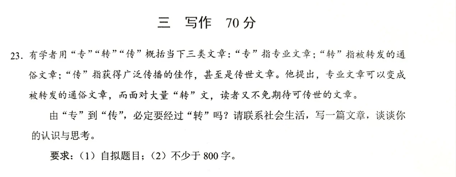 刚刚,2025年上海高考语文作文题公布:由“专”到“传”,必定要经过“转”吗?