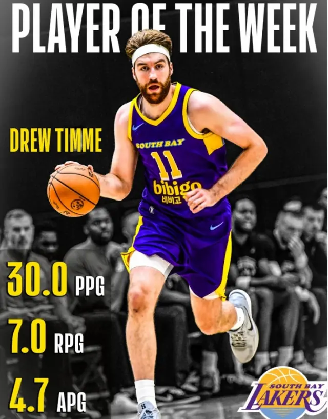 德鲁・蒂米拿了 NBA G 联赛首周最佳球员称号。他场均 30 分 7 篮板 4.7 助攻大满贯平台,南湾湖人 3 胜 0 负。