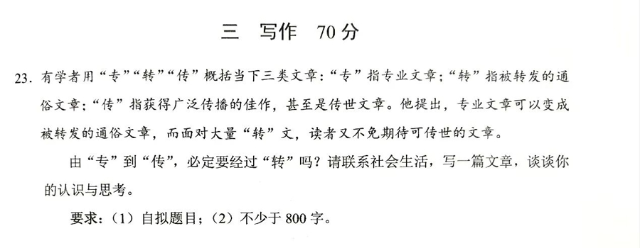 这次命题虽然看上去罗列了三个概念大满贯注册,“专”指专业文章:“转”指被转发的通俗文章:“传”指获得广泛传播的佳作,甚至是传世文章。但实际上要求考量学生的难度还是和以往一致,由“专”到“传”是否要经过“转”?学生一般选择“是”和“否”,或者“部分是”等。从逻辑上来看,还是两个概念的简单命题推断,可见命题者体量考生的良苦用心。